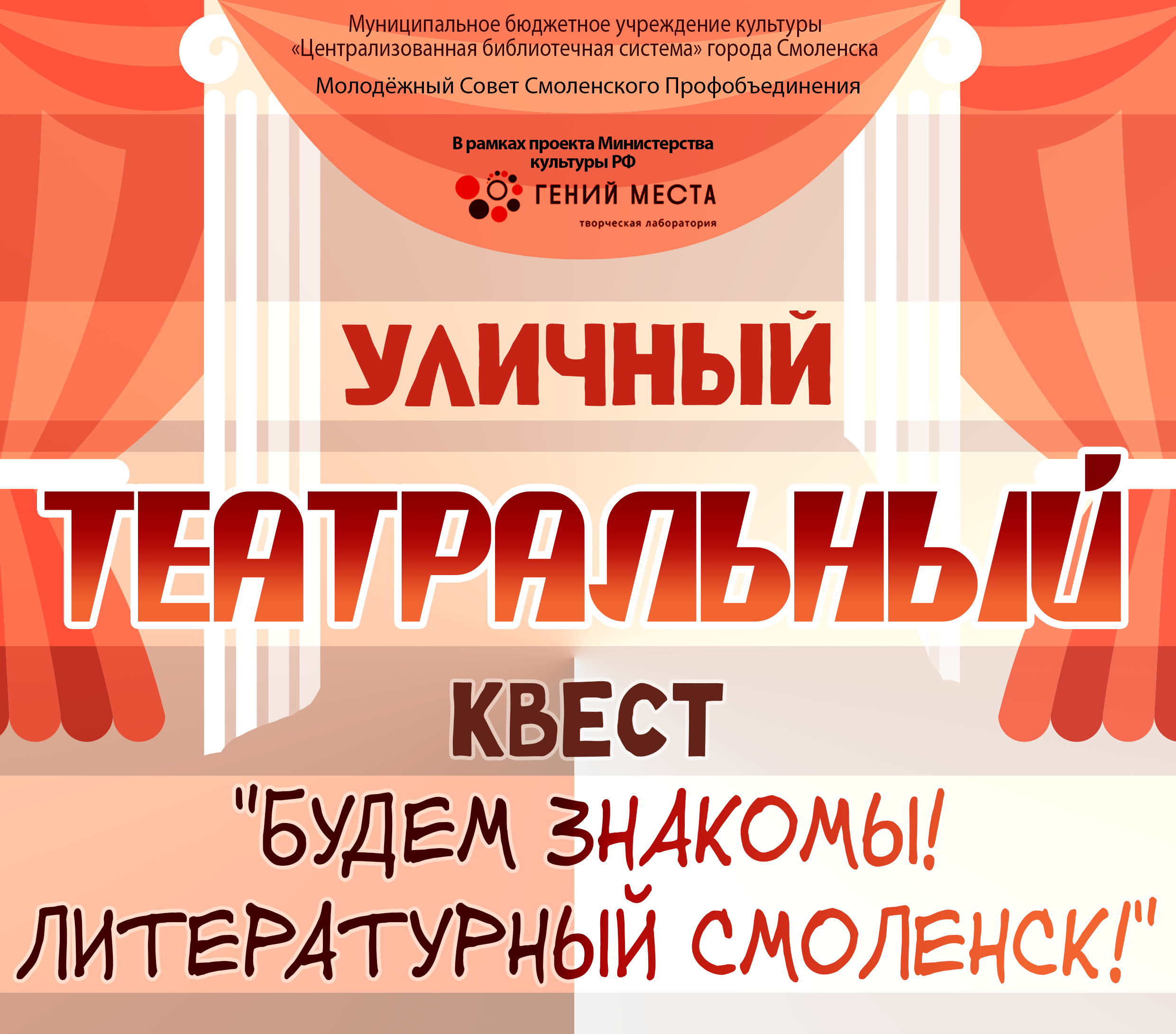 В Смоленске 26 марта состоялся уличный театральный квест «Будем знакомы! Литературный Смоленск!», организатором которого выступили муниципальные библиотеки города Смоленска и молодёжный Совет ...