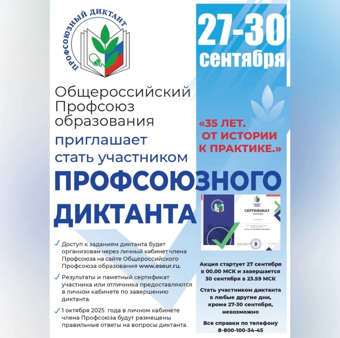 27 сентября, в день рождения Общероссийского Профсоюза образования, стартует ежегодная Всероссийская просветительская онлайн-акция «Профсоюзный диктант». Тема диктанта в этом году - «35 лет. От истории к практике».